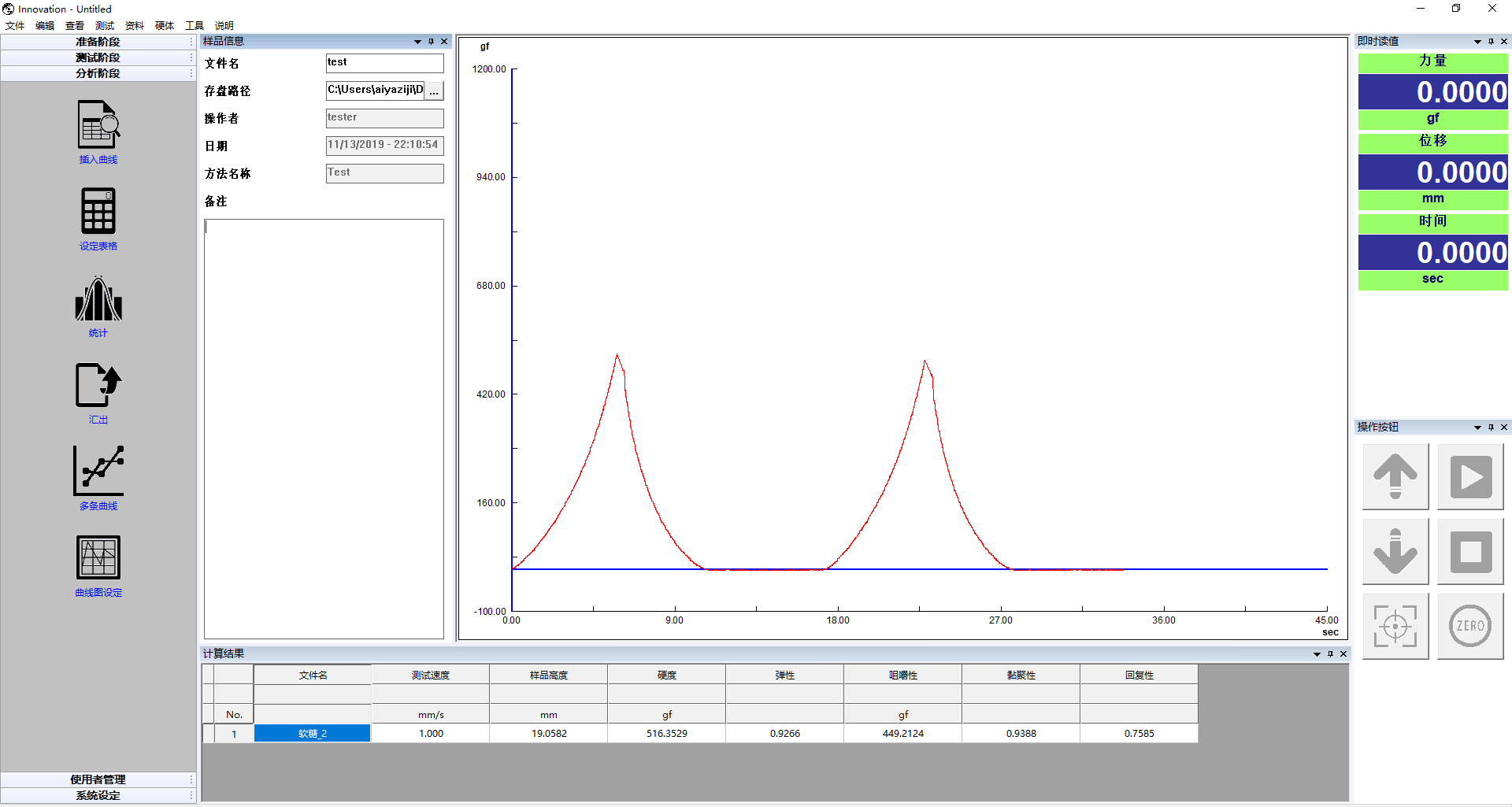 测试软件:中英文切换,功能强大,进行各类食品样品的质构分析;软件测试过程中,带有实时显示框,检测数据可以实时显示,用户直观看到检测数据的变化、数据收集、实时曲线绘制和数据分析同步实时进行;同时,软件可以设置力量感应元的保护范围。